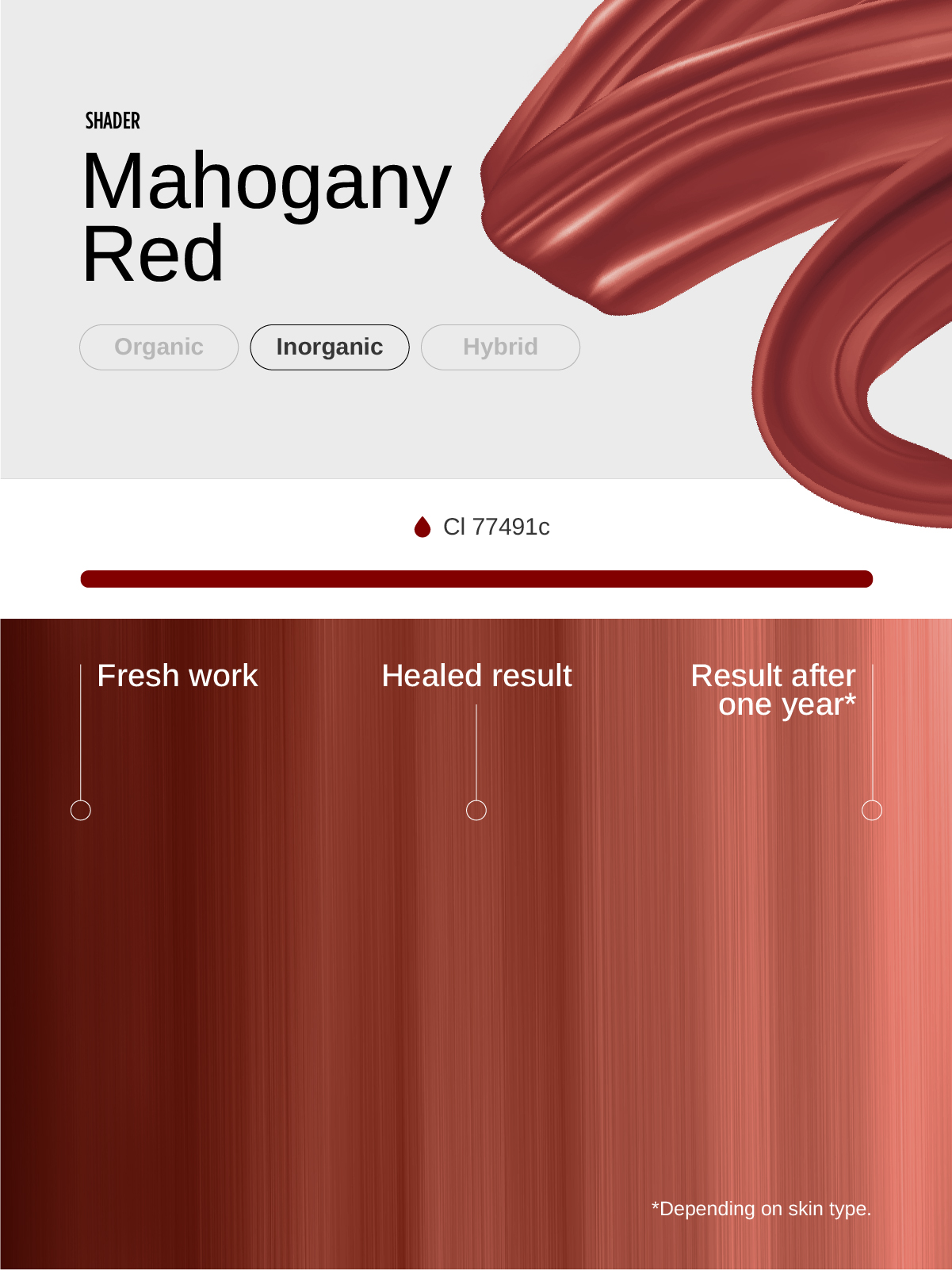 Purely Inorganic: Mahogany Red is an inorganic pigment. Inorganic pigments are known for their seamless integration into the skin for the ultimate natural look and effect. Its formulation ensures stability, safety, and a seamless blend with the skin’s natural coloration.